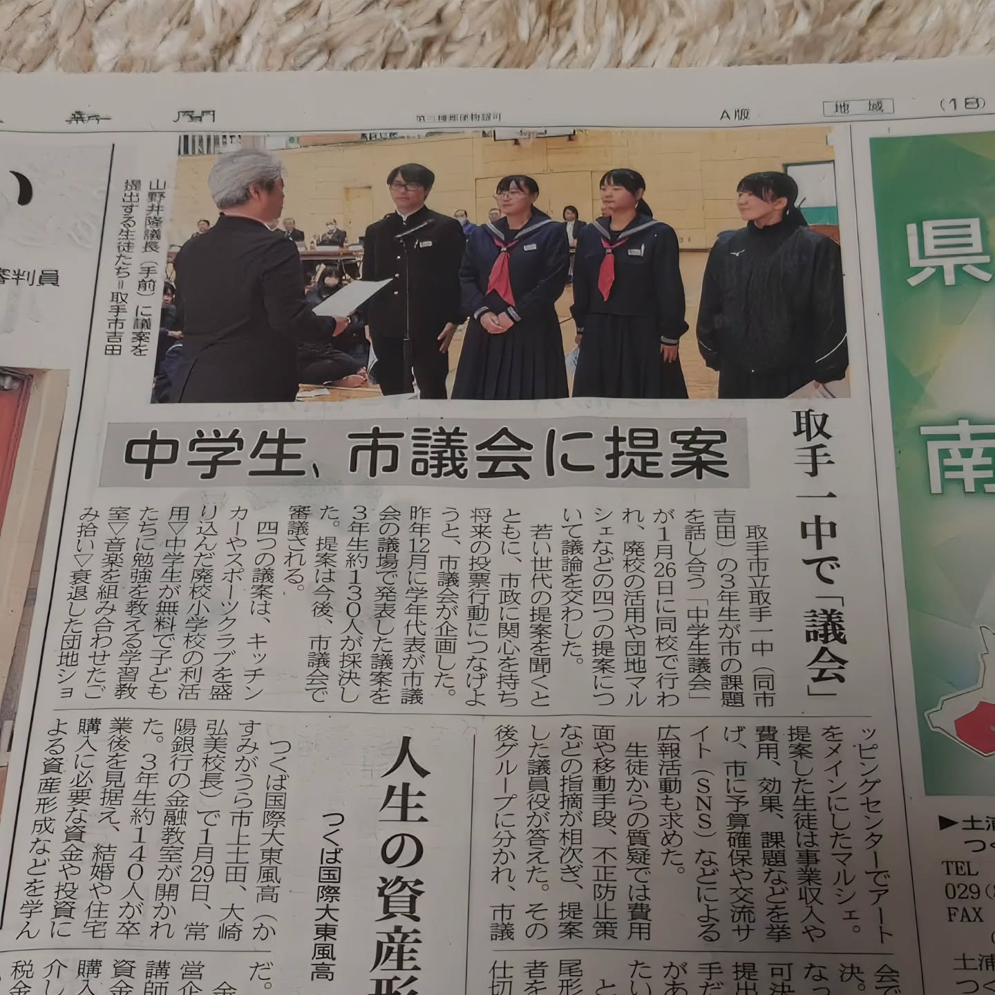取手市議会で企画した「中学生議会」の様子が、茨城新聞に取り上げられました。